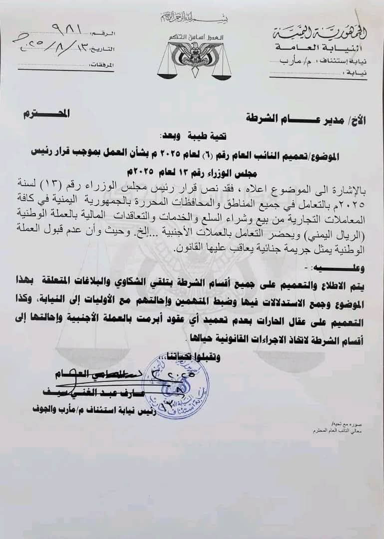 وجه رئيس نيابة استئناف محافظة مأرب القاضي/عارف عبدالغني سيف رسالة إلى مدير عام الشرطة بالمحافظة بشأن ضبط كل من يتعامل بالعملة الأجنبية